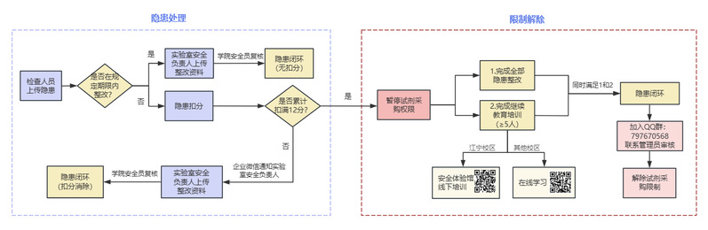 注:在校级检查中,若课题组名下有实验室隐患累计扣满12分,学校将暂停课题组危化品的采购权限,现场隐患全部整改且实验人员参加继续教育后,方可恢复采购权限。